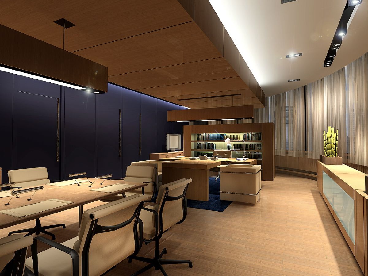 Место руководителя организовано, как и в первом случае, с Т-образным столом и креслами по сторонам брифа. Пол акцентирован темно-синим ковром, в этот же цвет окрашена продольная стена. Насыщенный синий – благородное дополнение к природной гамме интерьера.