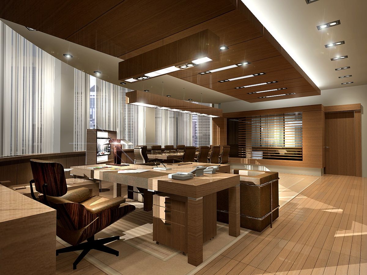 Письменный стол имеет Т-образную форму и лишен излишеств, в качестве системы хранения используется выдвижная тумба. По обеим сторонам от брифа установлены два кресла в форме кубов, их темно-коричневая обивка повторяет цвет кресла руководителя.