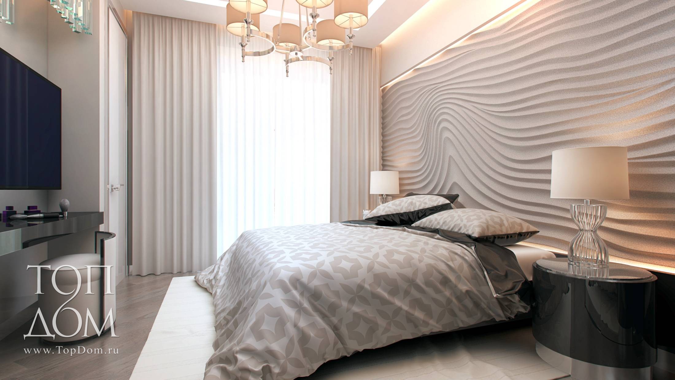 Стена за изголовьем кровати – акцентная, ее выделяют контрастным цветом, фактурной отделкой, графикой. Дополнительные яркие пятна в оформлении: подушки, обивка кресел, шторы.