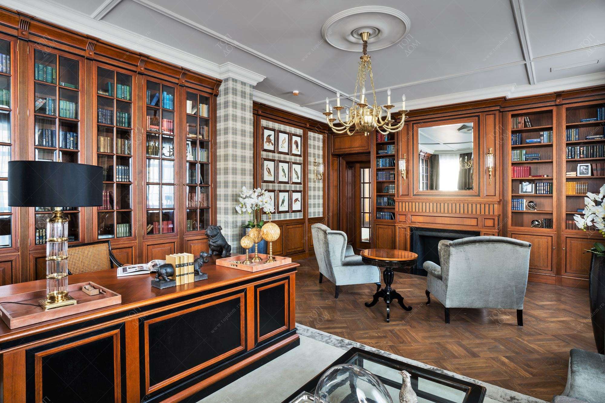 Это классика интерьерного дизайна, насыщенная деревом и текстилем обстановка с характерными чертами. Стены отделывают деревянными панелями и тканью или дорогими обоями с вертикальными полосами, цветочными мотивами. Потолок украшают лепниной. Для пола в дизайне кабинета используют паркет, мрамор, доску из массива, натуральные камень или же керамогранит, искусно имитирующий эти фактуры.