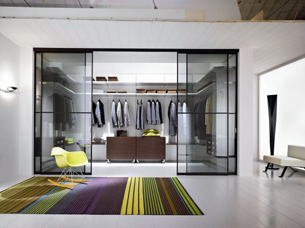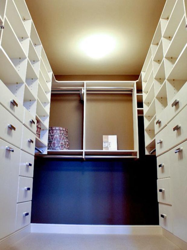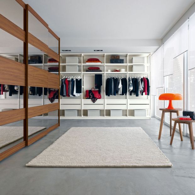 Шкафы, полки и штанги с вещами располагаются вдоль трех стен. Применима в спальне, гостиной, детской, от основного помещения отделяется перегородкой.
