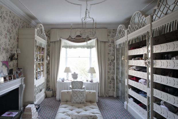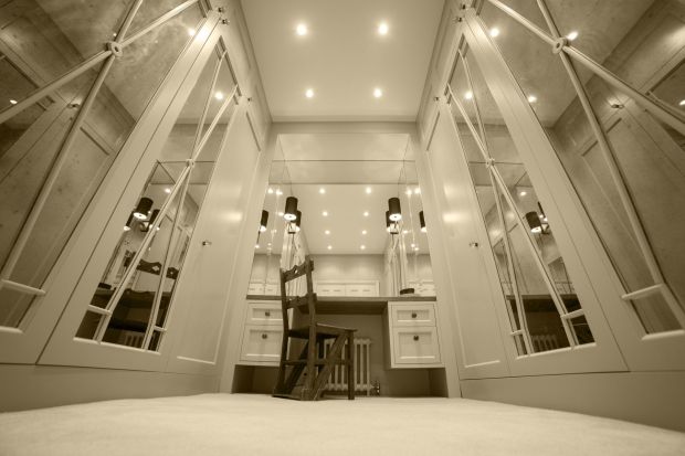 - Такая комната не просто хранилище одежды, но и примерочная. Оконные проемы обеспечат естественное освещение, подобрать наряд поможет зеркало в полный рост, за туалетным столиком можно спокойно нанести макияж.