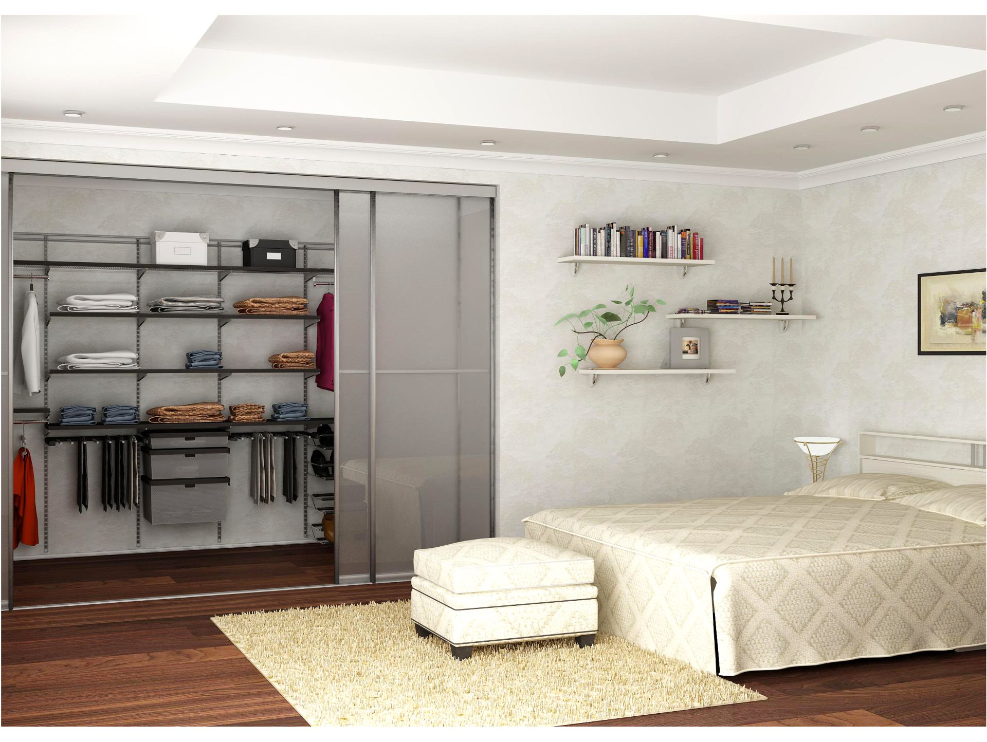 Шкафы, полки и штанги с вещами располагаются вдоль трех стен. Применима в спальне, гостиной, детской, от основного помещения отделяется перегородкой.