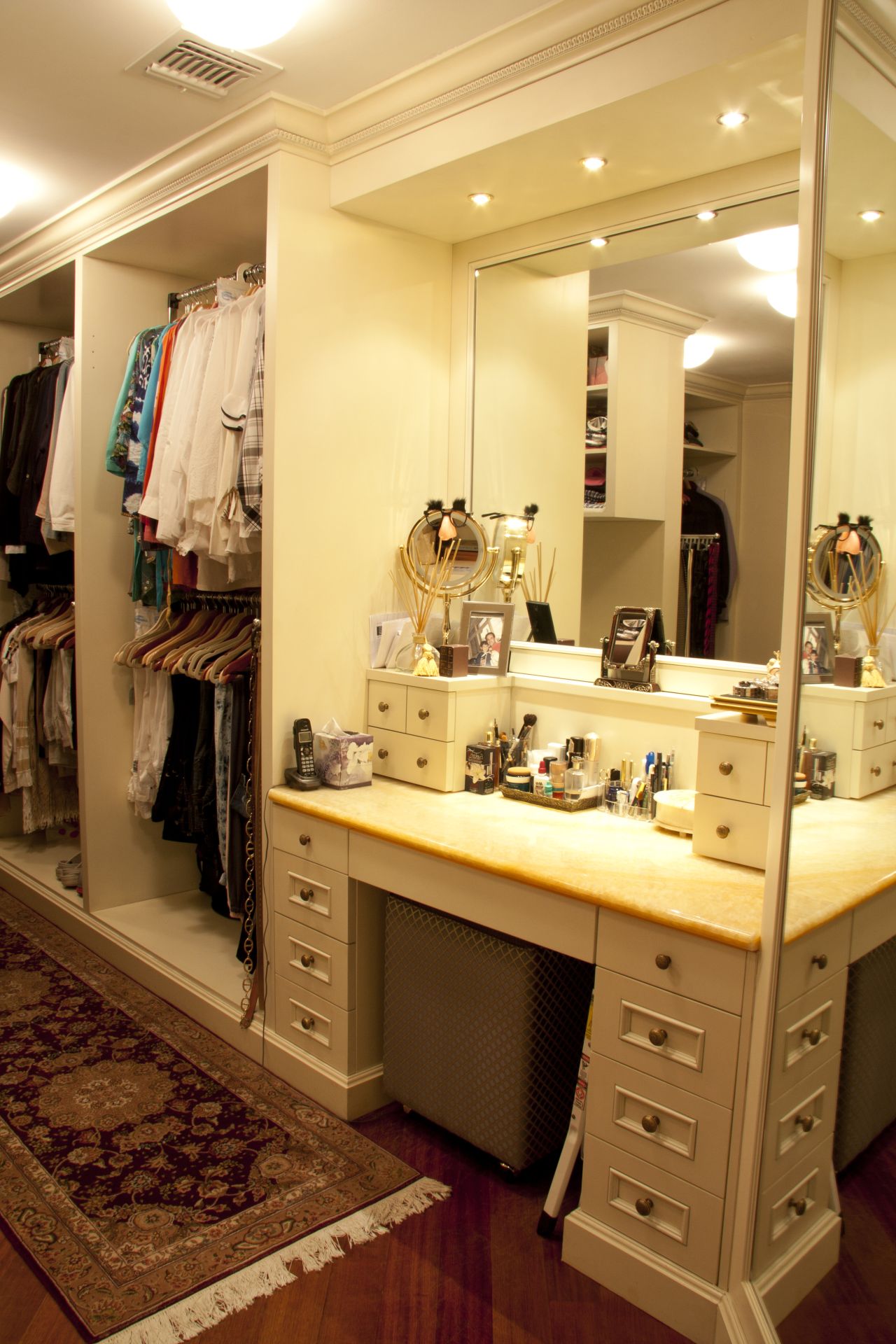 - Такая комната не просто хранилище одежды, но и примерочная. Оконные проемы обеспечат естественное освещение, подобрать наряд поможет зеркало в полный рост, за туалетным столиком можно спокойно нанести макияж.