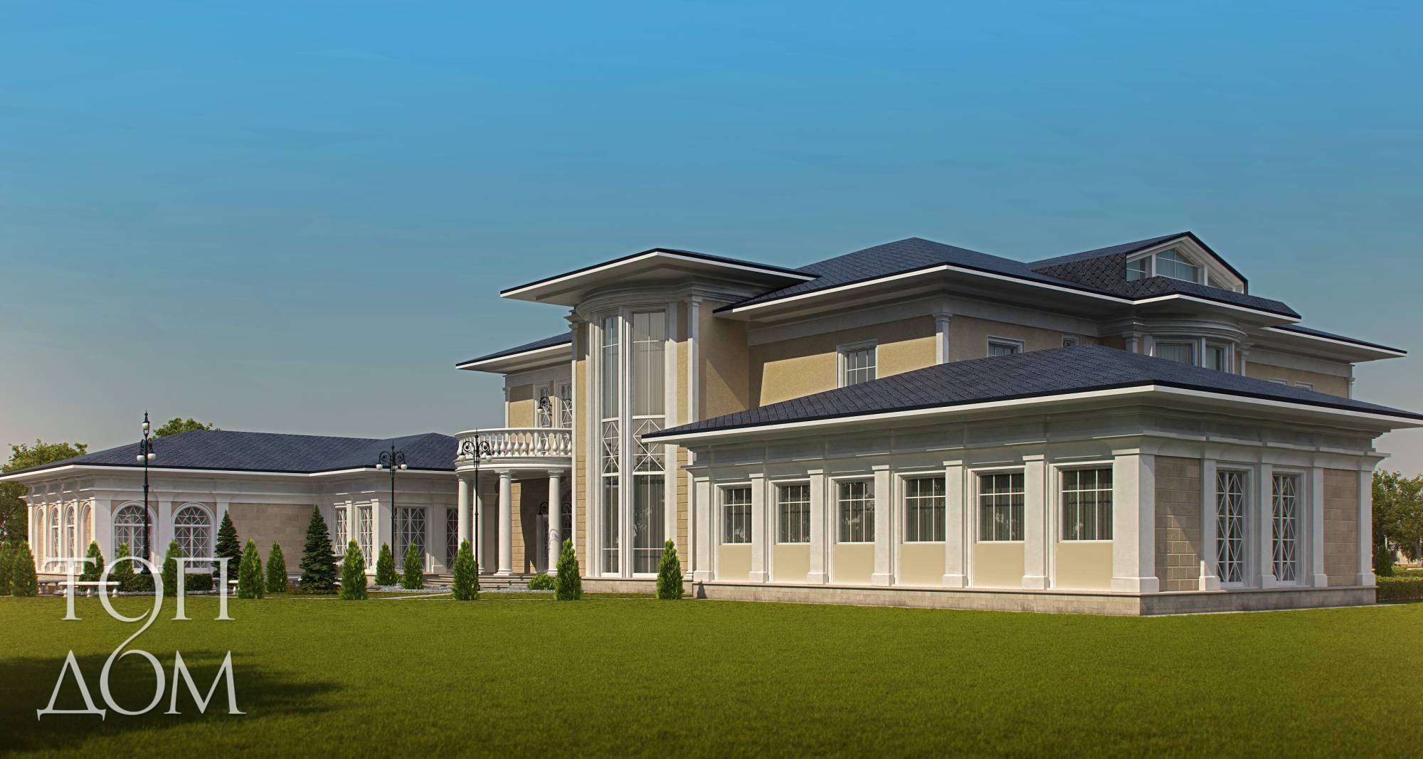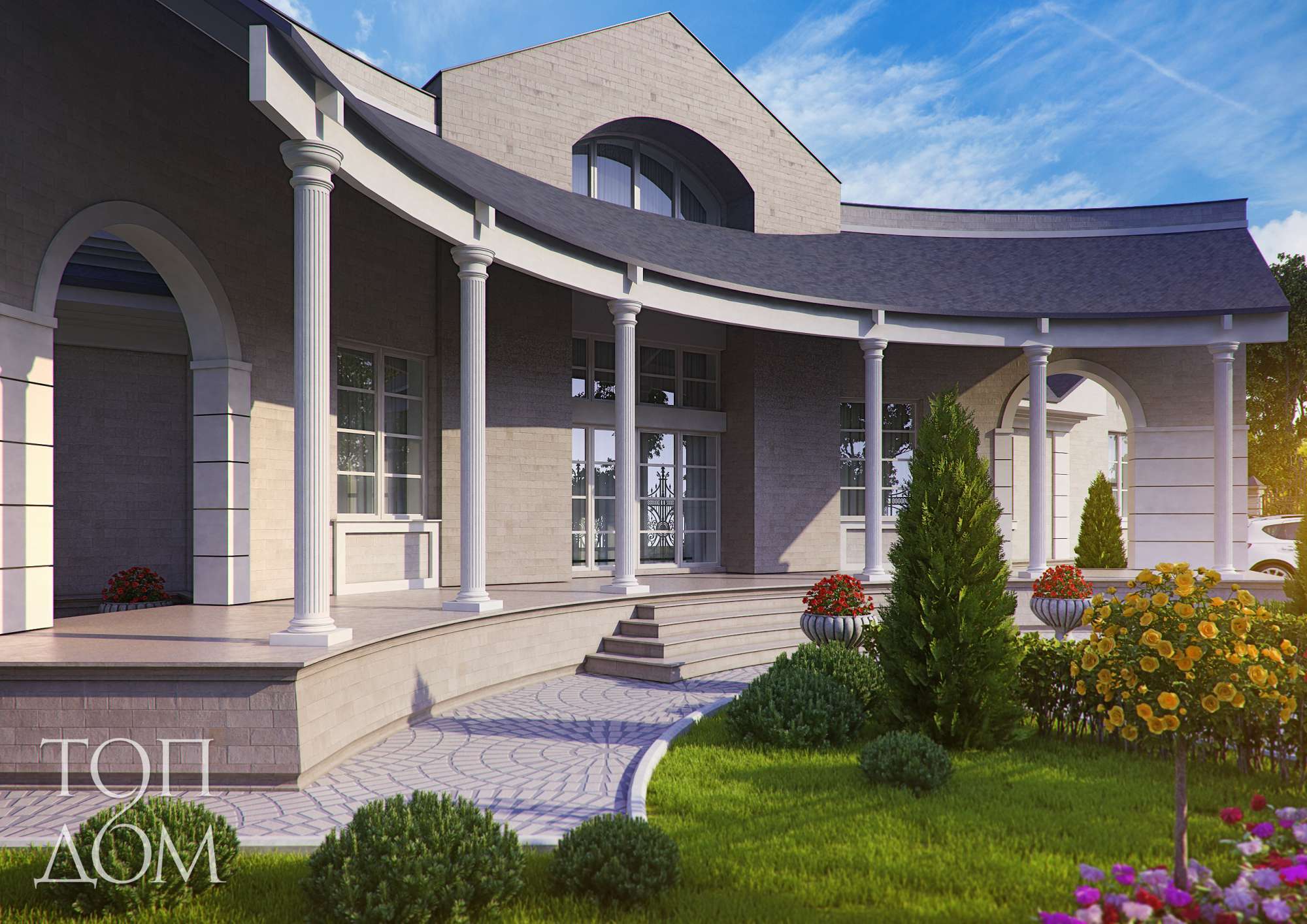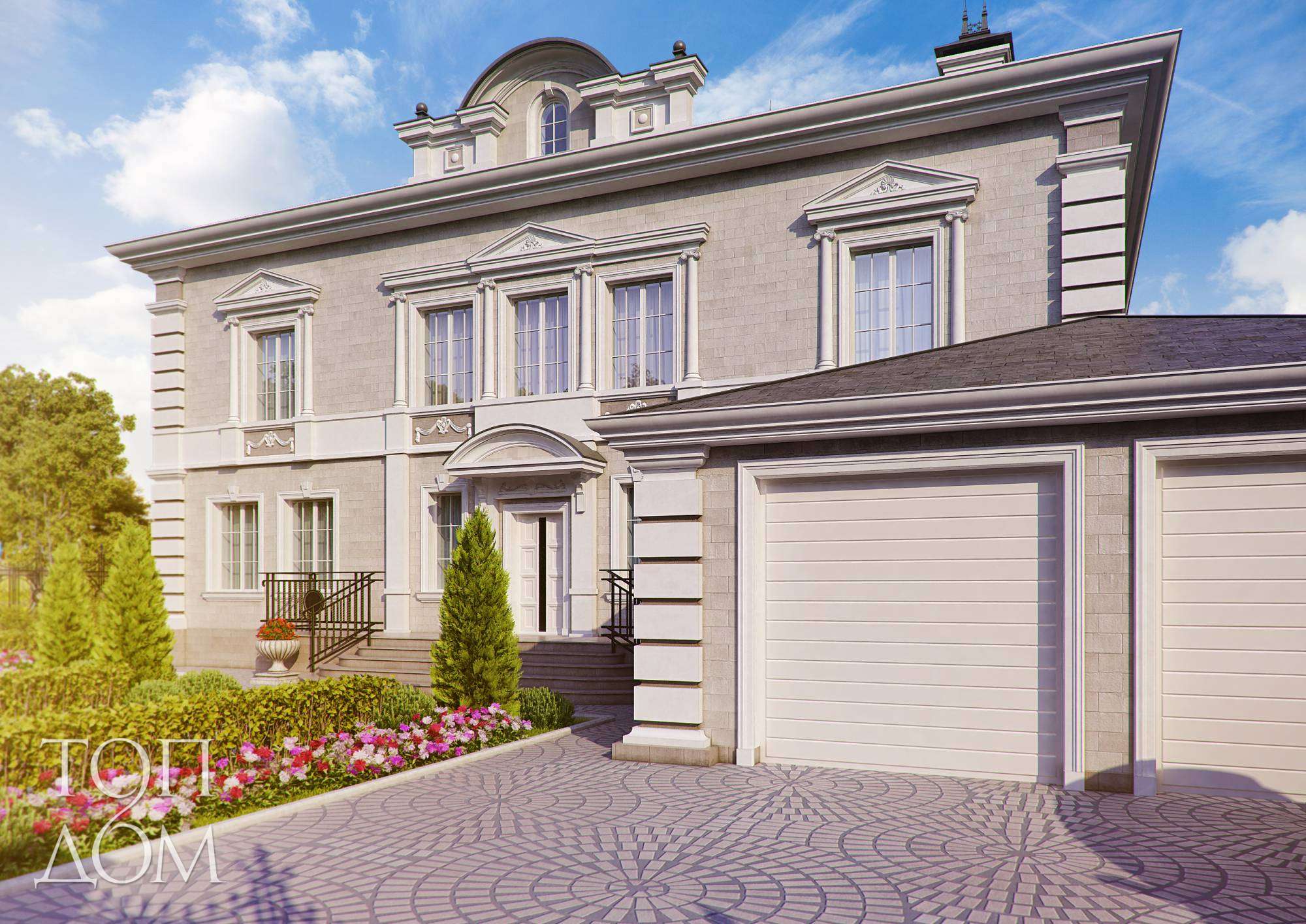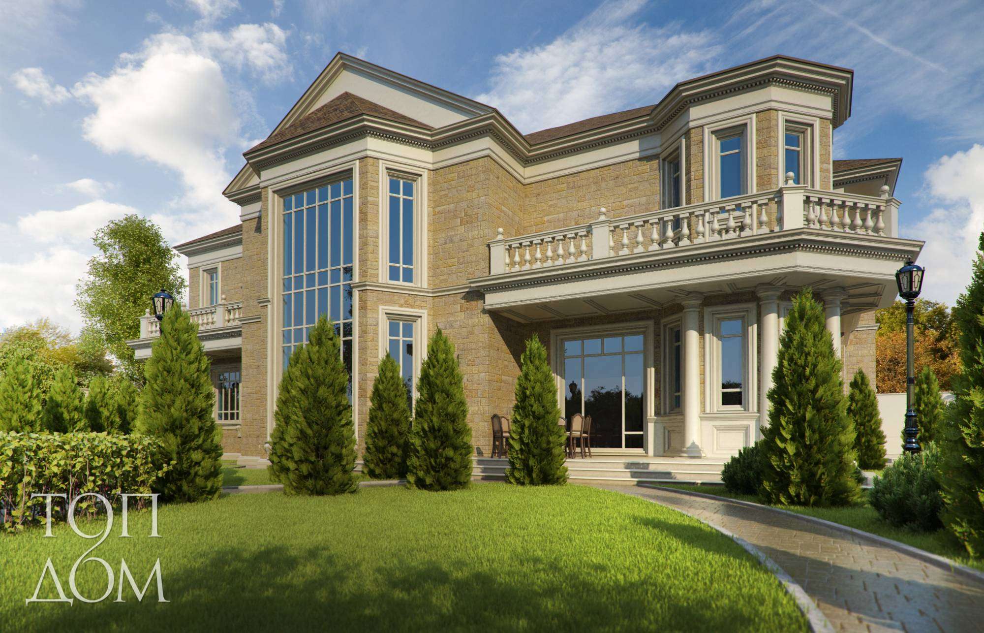 Дизайн фасада дома создается плавными линиями, спокойными тонами, замысловатым декором. Для отделки используют фасадную штукатурку, облицовочный кирпич, натуральный камень, бут, гипс. В роли экстерьерных акцентов выступают колонны, кованые решетки и перила балконов, лепные карнизы. Часто такой дом имеет веранду.