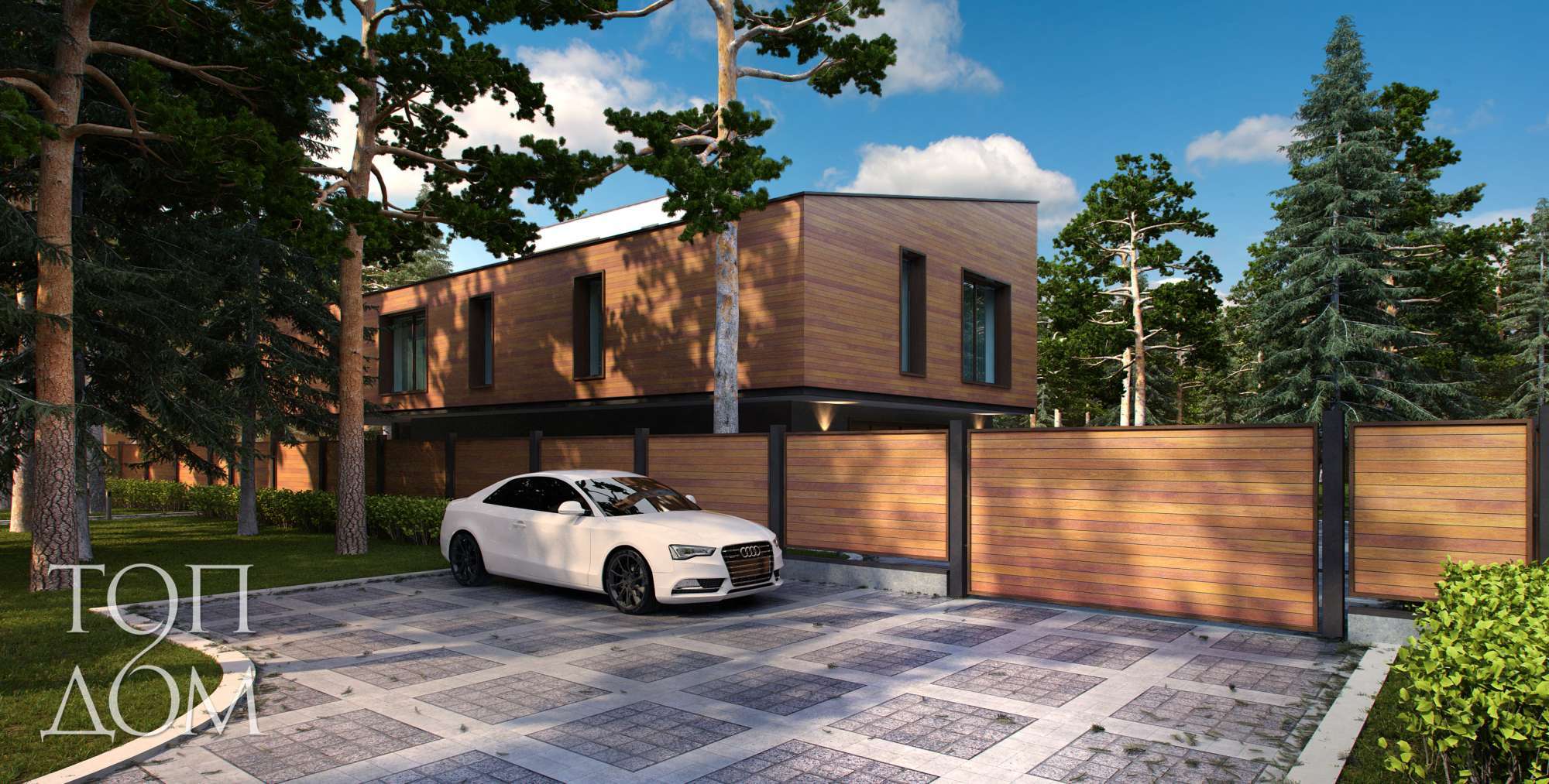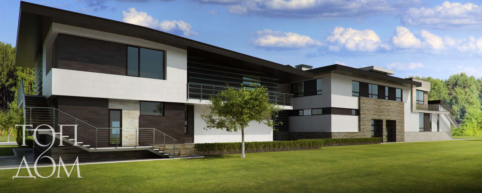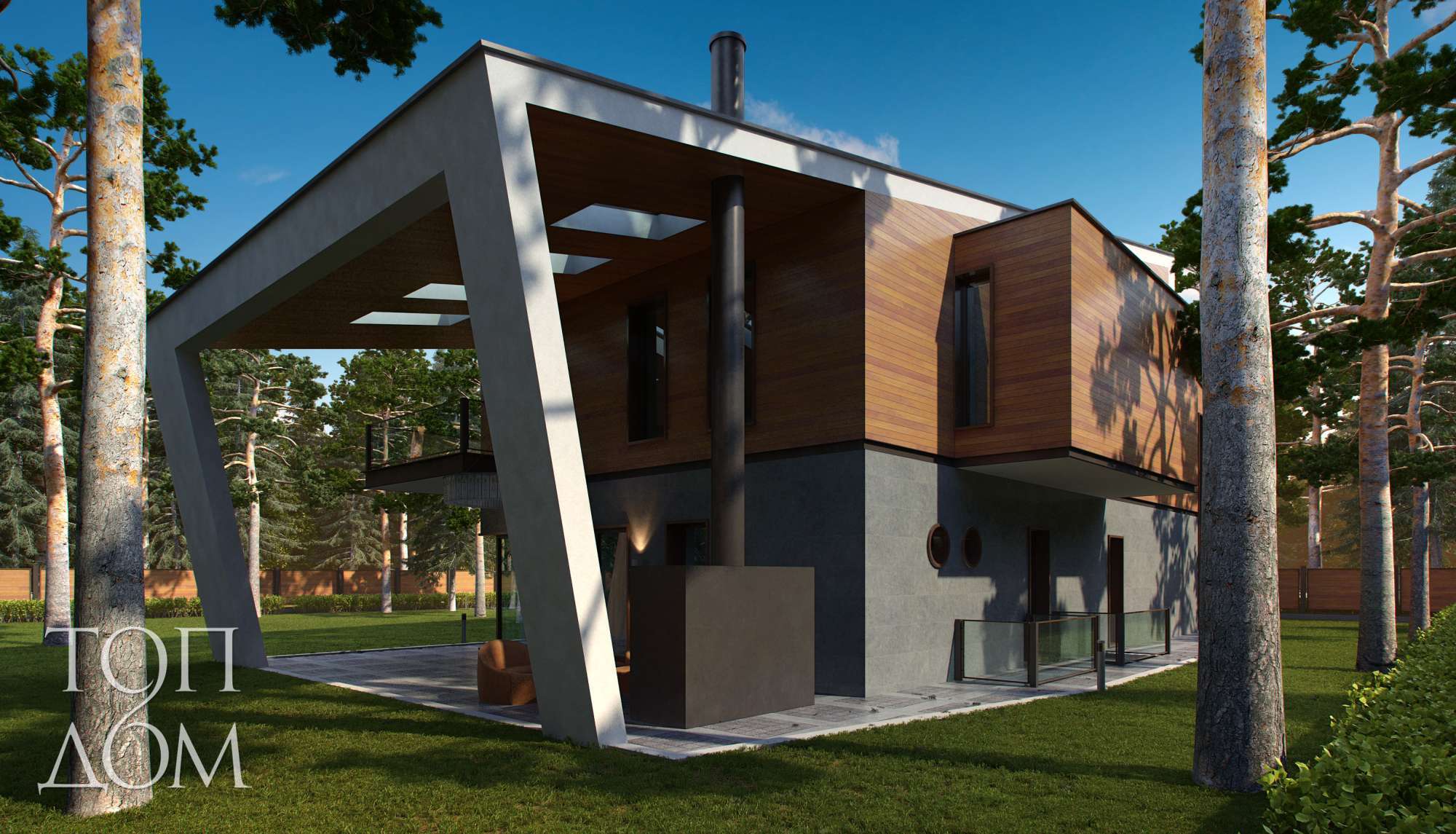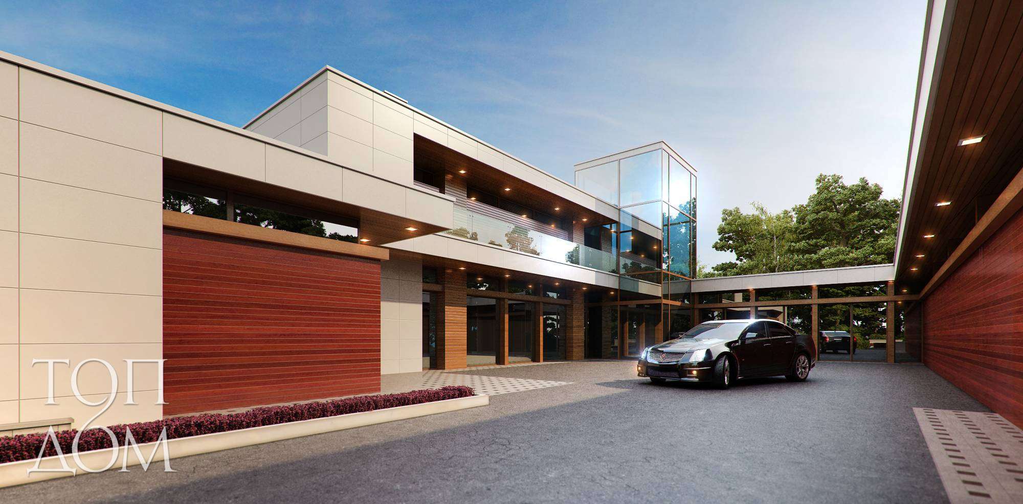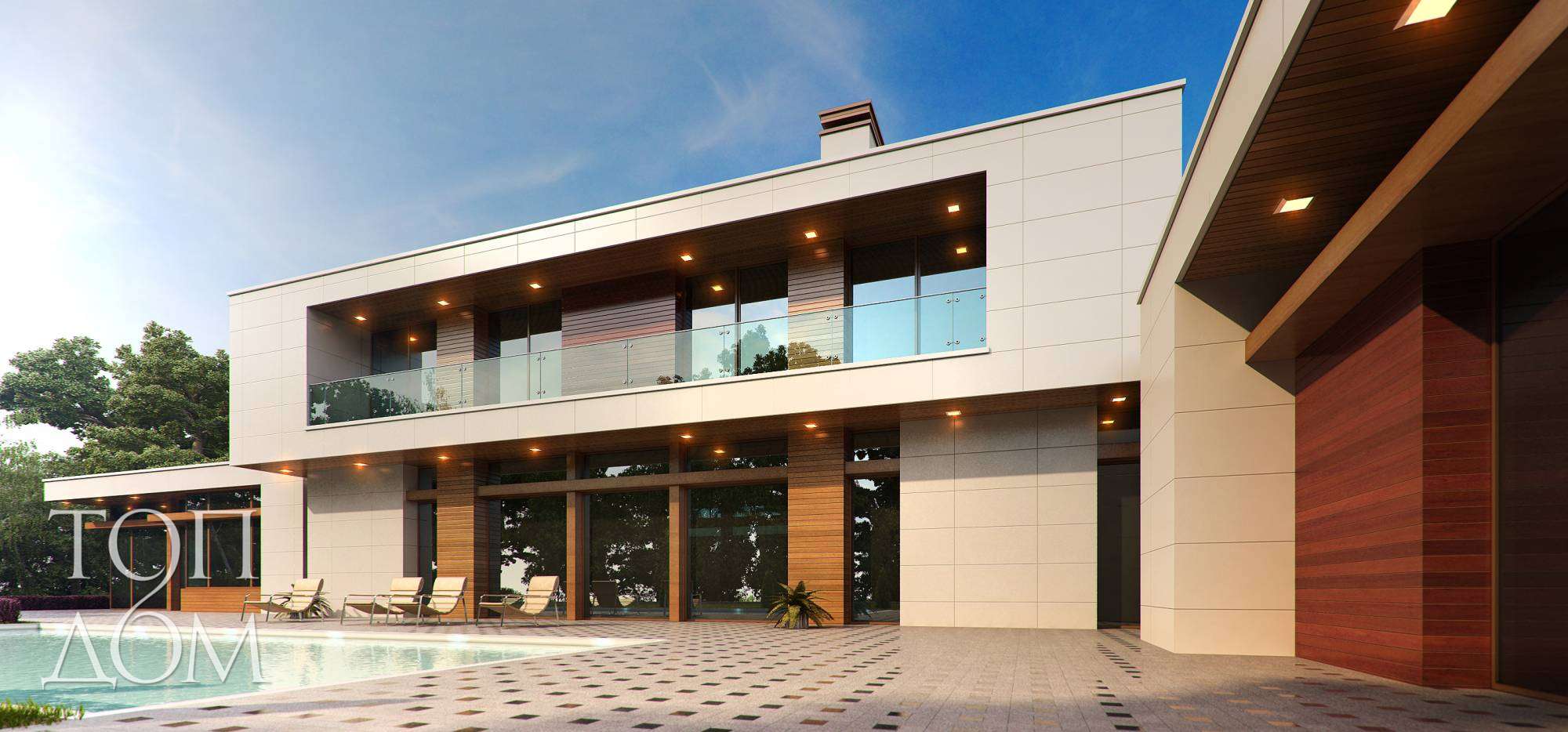 Современное направление дизайна фасадов частного дома, в котором доминирует функциональность и удобство, простота оформления и сдержанность объемных решений. Фасад отделывают стеклом, пластиком, металлом, сайдингом, плитами из керамзита. Цветовая палитра: белый, стальной, черный, цвет натурального дерева. Такие дома прекрасно впишутся как в городской пейзаж, так и в природное окружение.