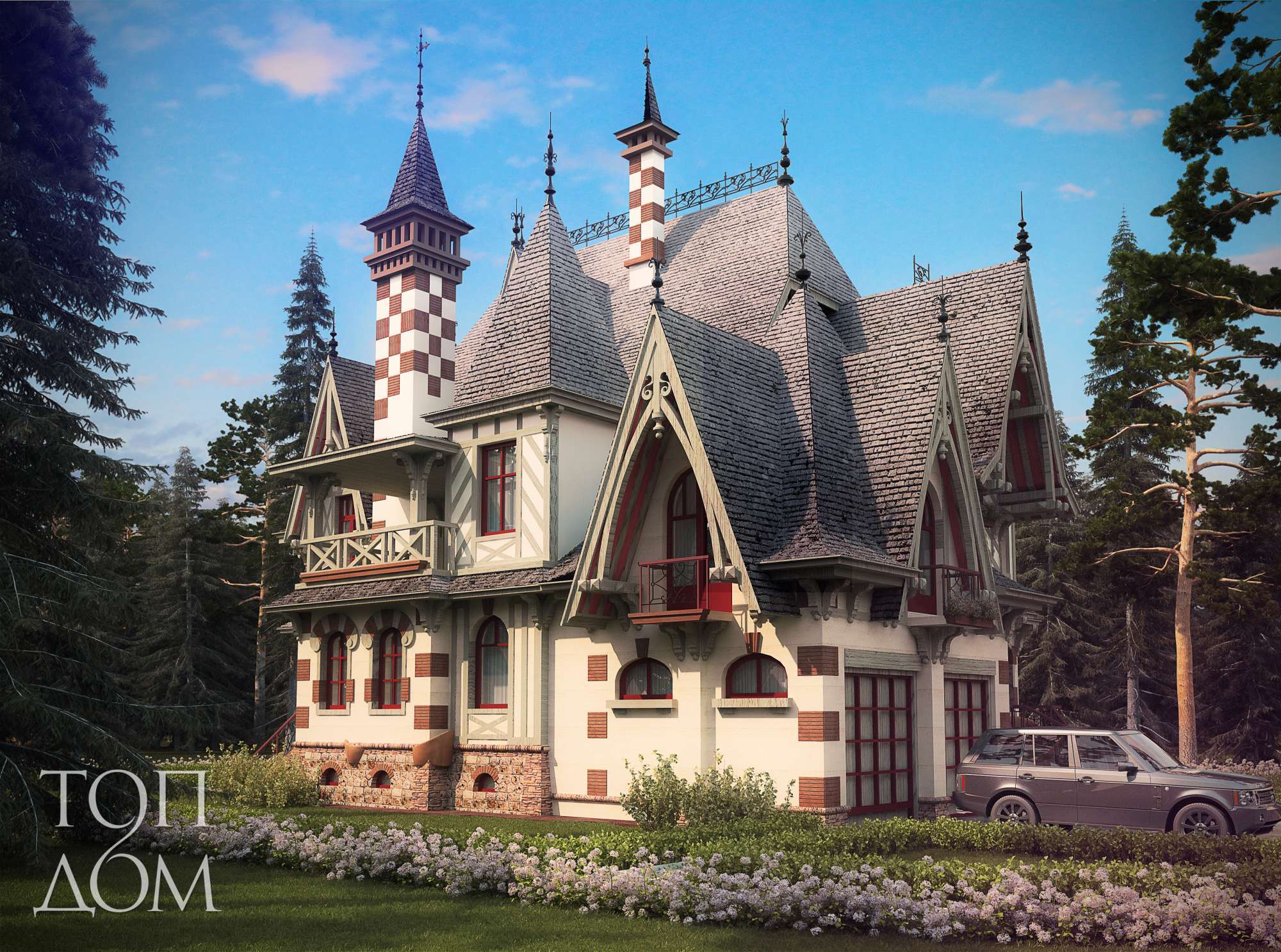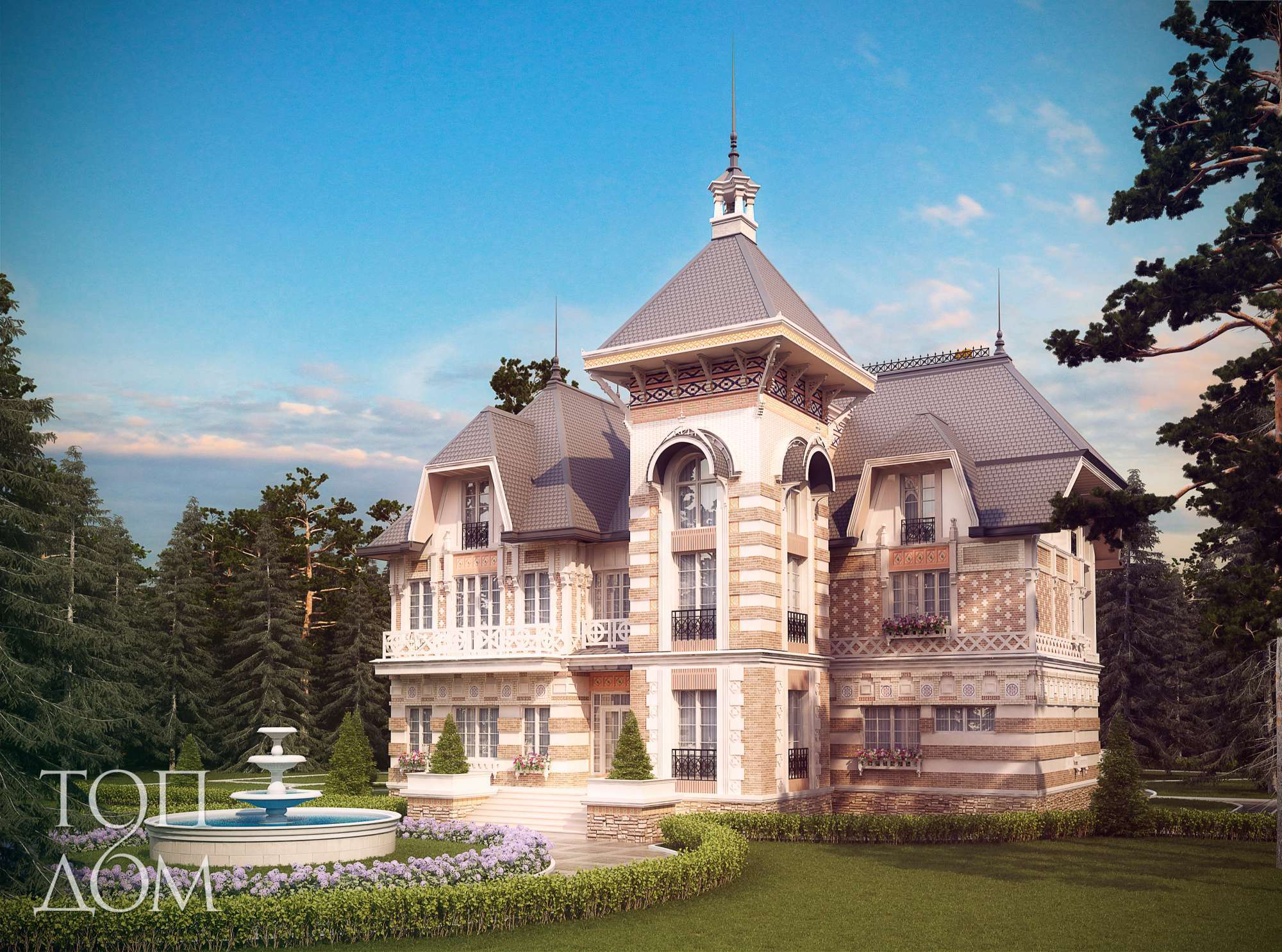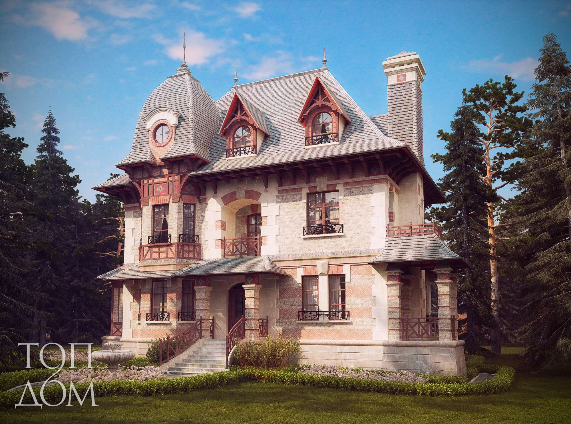 Отличается монументальностью. Преобладает отделка натуральным камнем, высокие фронтоны, башни, архитектура может быть несимметричной, но обязательна труба от дымохода.