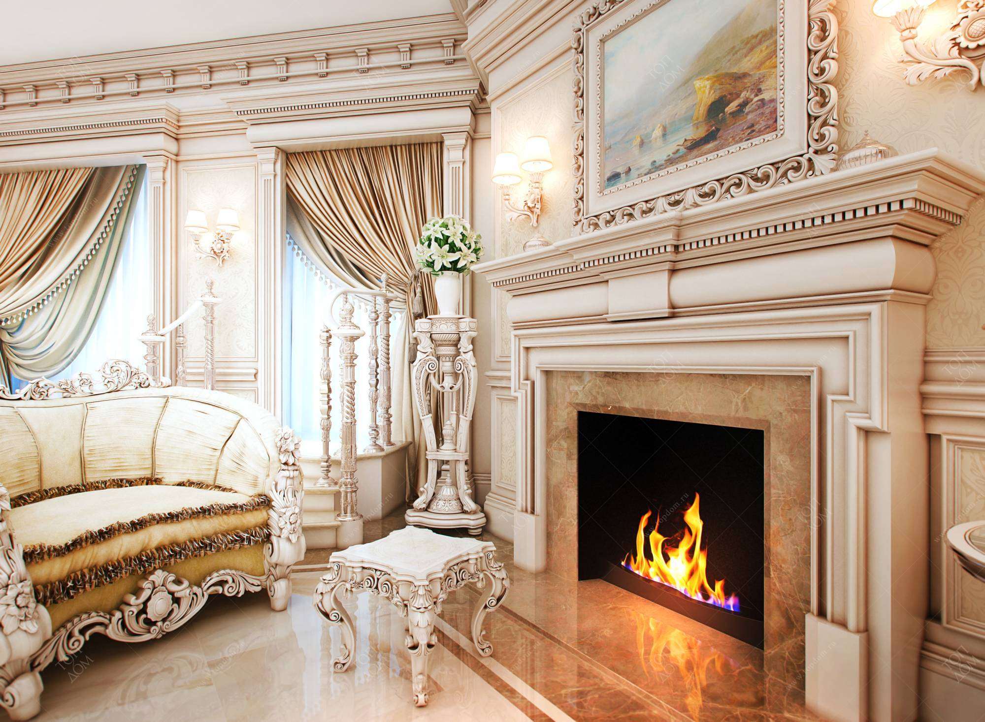 В классическом исполнении используют мраморную или древесную облицовку. Боковые опоры украшают кариатидами, пилястрами. Непременный атрибут – широкая полка, где стоят античные статуэтки, подсвечники.