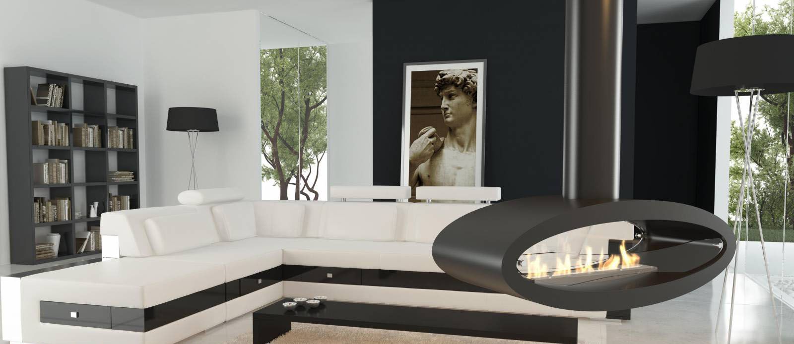 Как ясно из названия, камин лишен традиционной напольной опоры и подвешивается под потолок. Высота и угол поворота регулируются. Дымоход прямой, поэтому сажа здесь не накапливается. Чтобы камин равномерно распределял тепло, его монтируют в центре помещения.