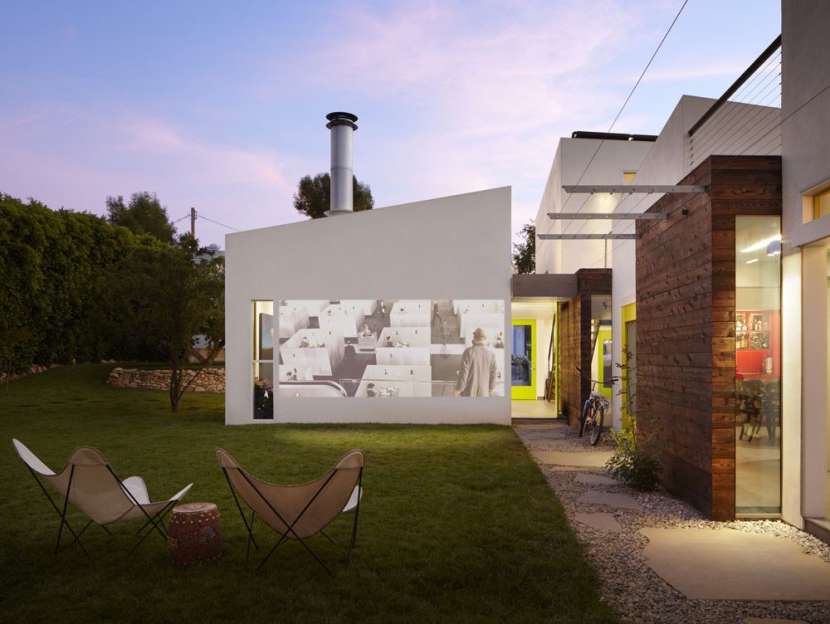 Это место на открытом воздухе: на зеленой лужайке за домом, на террасе, в беседке. Современные модели выдерживают прямое попадание влаги, так что не нужно переживать из-за работы поливочной установки. В этом случае интерьер домашнего кинотеатра – понятие условное.
