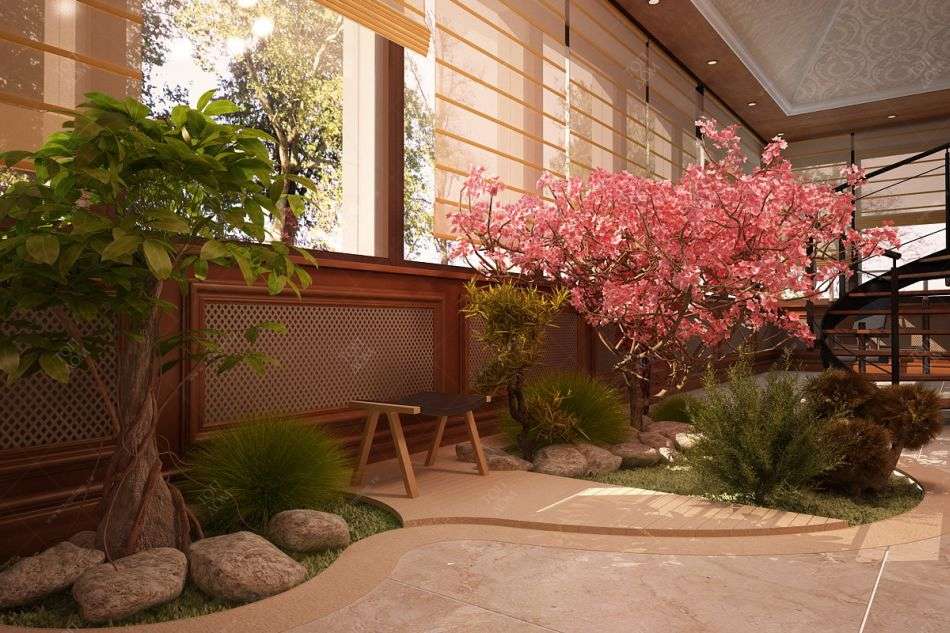 Миниатюрные водопады выполнят роль "воды", а можно заменить водяную гладь комбинацией песка и гравия. Органично смотрятся неотесанные камни, облепленные мхом. Очень красивы декоративные мостики, изгороди из бамбука. Важно иметь представление о смысле того или иного растения. Самое известное олицетворение благополучия и чистоты – сакура. В российском исполнении ее можно заменить вишней или искусственным деревом. Создавая интерьер зимнего сада в японском стиле, помните про бонсай.