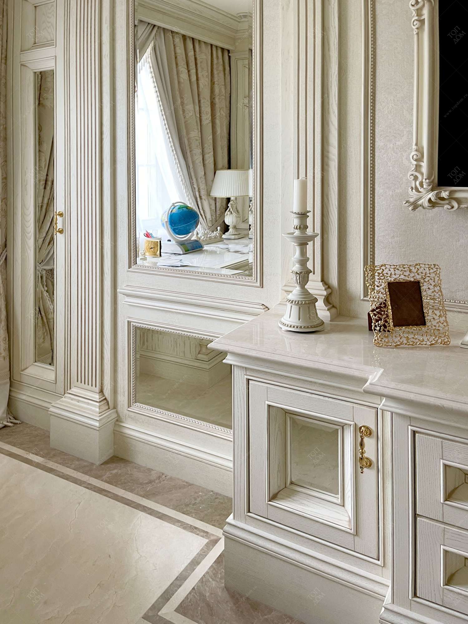 Пышная драпировка портьер с многослойными ламбрекенами, хрустальные люстры и светильники с канделябрами дополняют классический интерьер.
