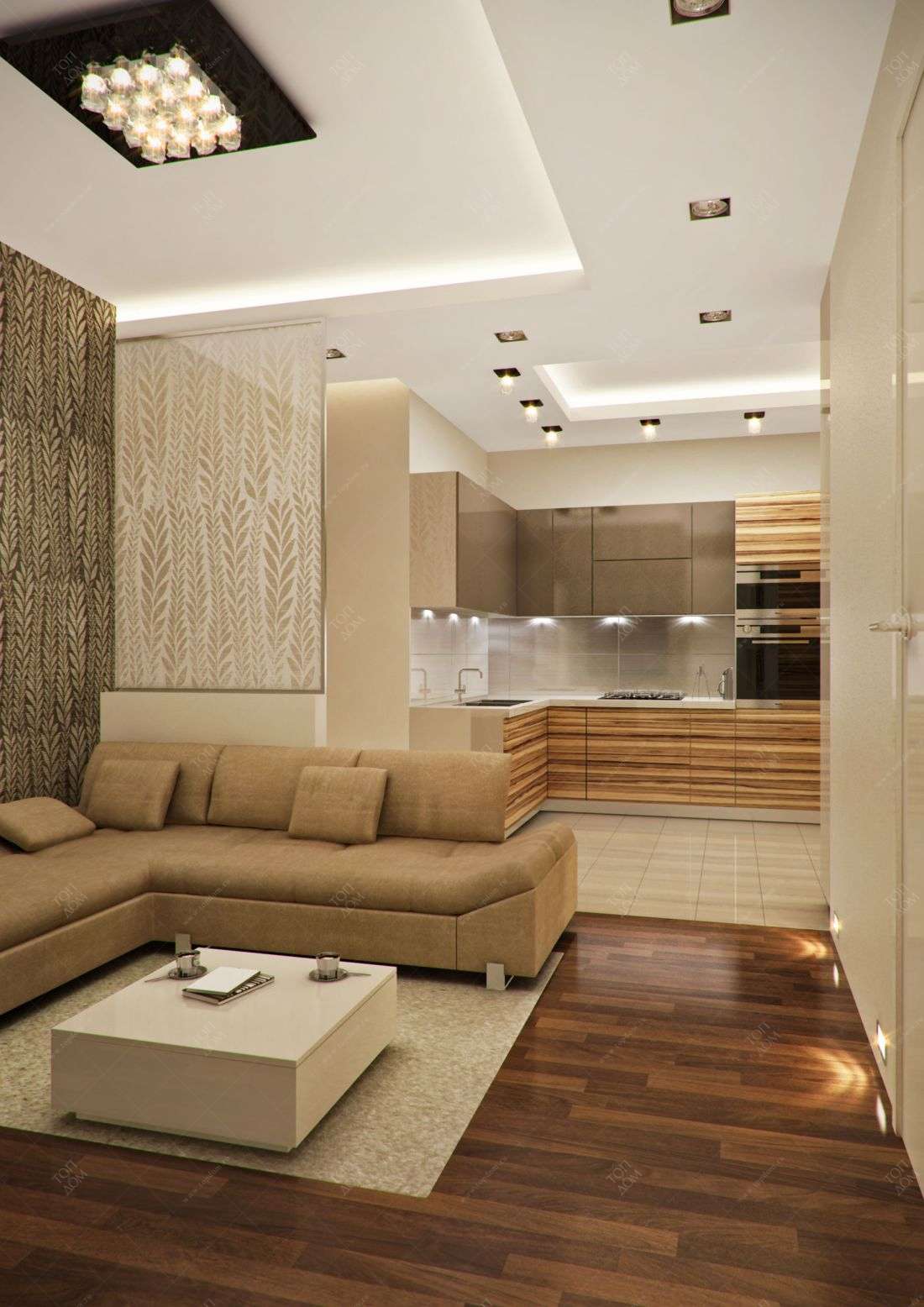 - двухуровневый пол – кухонная зона чуть приподнята (в такой подиум прячут коммуникации) или опущена по сравнению с уровнем гостиной, если позволяет высота помещений. Второй способ обозначить границу: использовать разные напольные покрытия или однотипное, но с отличающейся фактурой и рисунком;