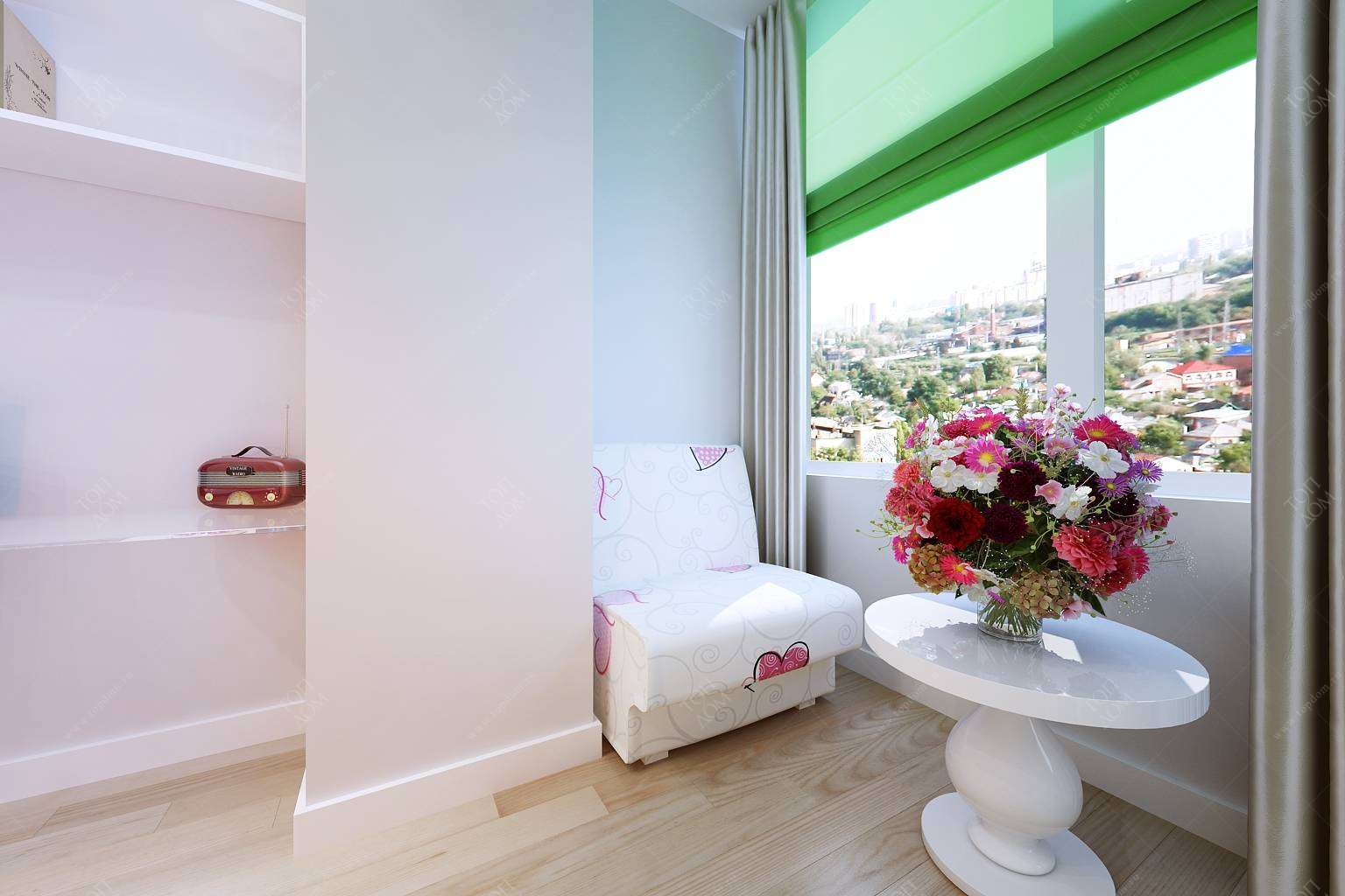 - Если на лоджии обустроен кабинет или место отдыха в стилистике минимализма, хай-тек, необходимо в интерьер балкона ввести яркое цветовое пятно.