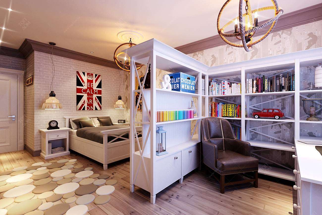 В современном варианте уместны насыщенные цветовые акценты, поверхность стен окрашивают или отделывают обоями светлых тонов. Потолок украшают подвесными конструкциями со встроенной подсветкой: в форме волн, облаков, цветочных бутонов. Напольным покрытием чаще всего служит практичный ламинат или ковролин. Мебель мобильна и легко трансформируется. Высокие гардеробные шкафы до потолка помогут сохранить пространство свободным.