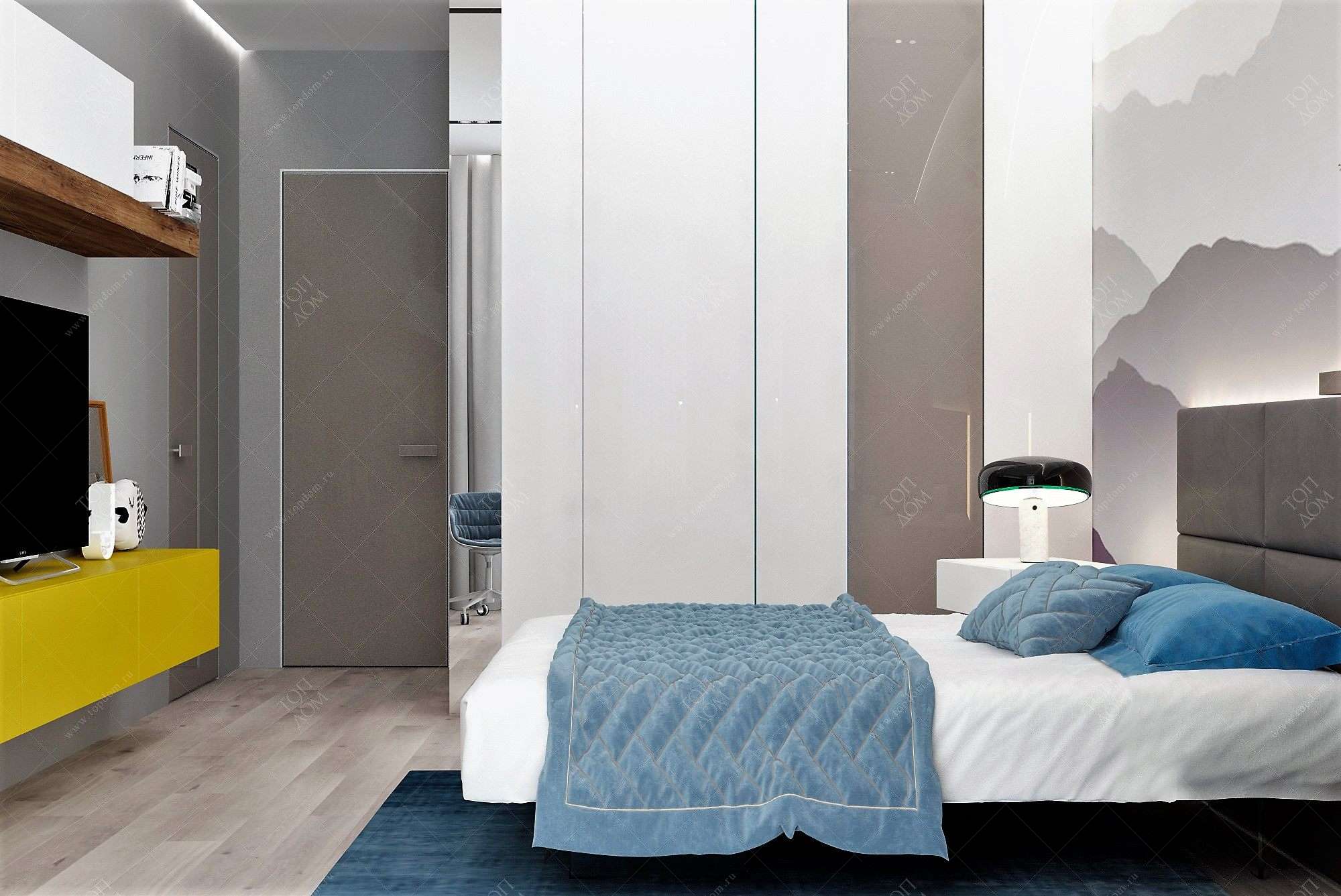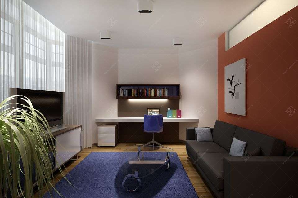 - В холостяцкой квартире обязательно организованы гостиная и спальня. А третье помещение можно занять кабинетом, тренажерным залом, гардеробной, домашним кинотеатром или обустроить здесь комнату для гостей.
