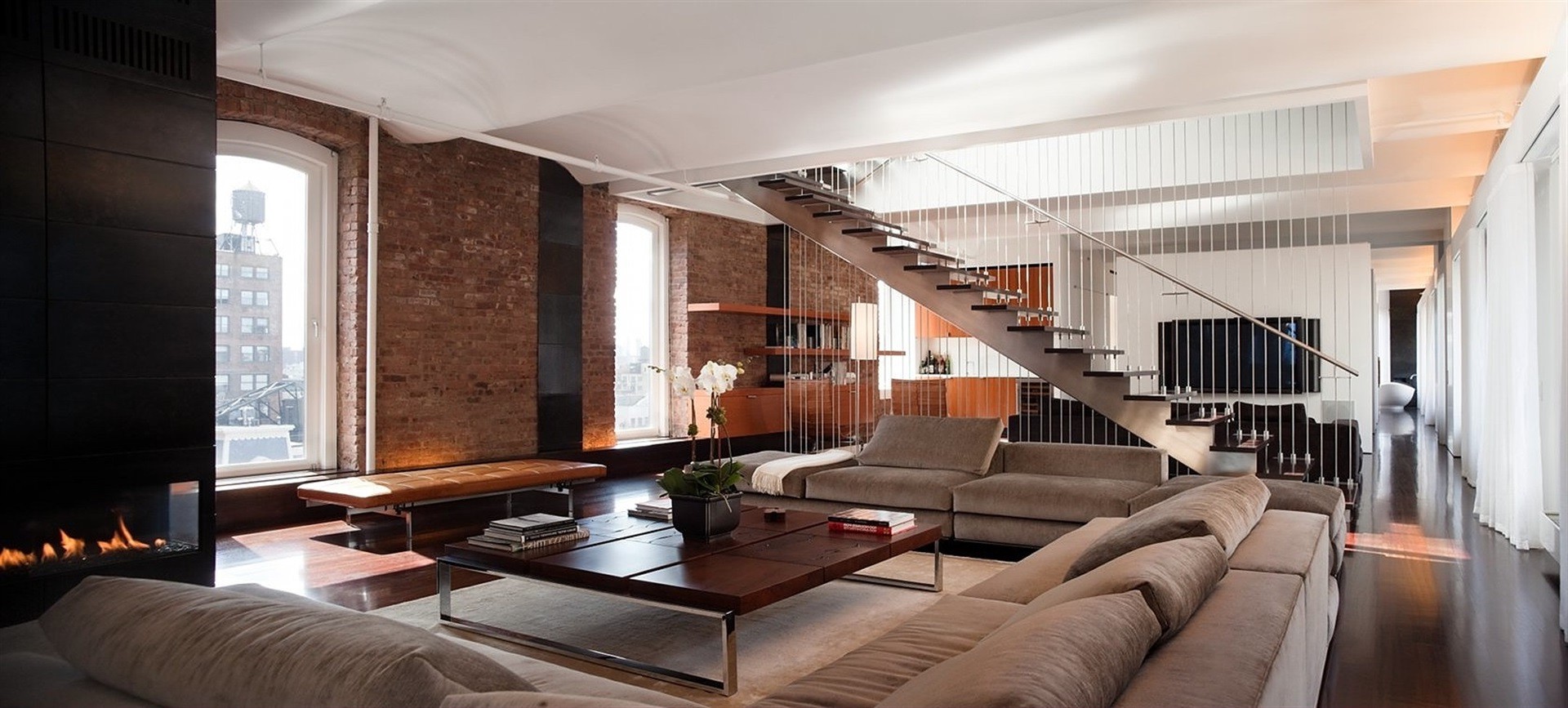 Современный лофт в интерьере комбинирует большое пространство, индустриальную отделку и антураж промышленного цеха с комфортной обстановкой жилой зоны.