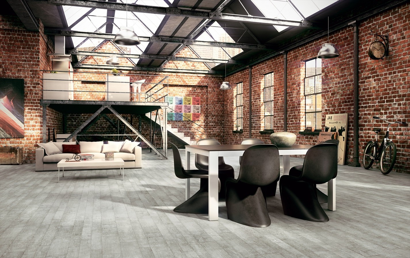 Окрашивают поверхности обычно в холодную или нейтральную палитру. Так создается демократичная, непринужденная обстановка, где любой кожаный диван простой формы приобретает харизматичный лоск. - Пол
