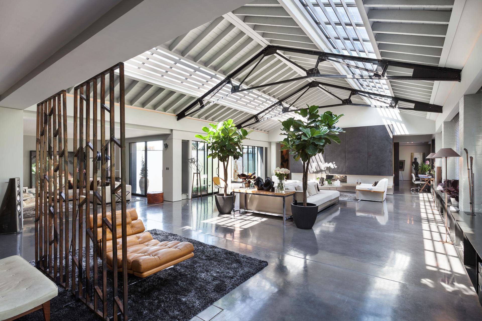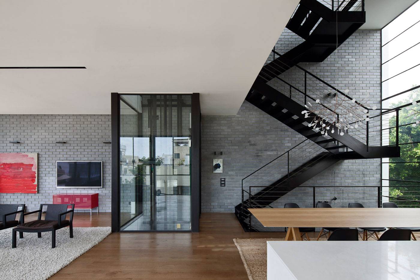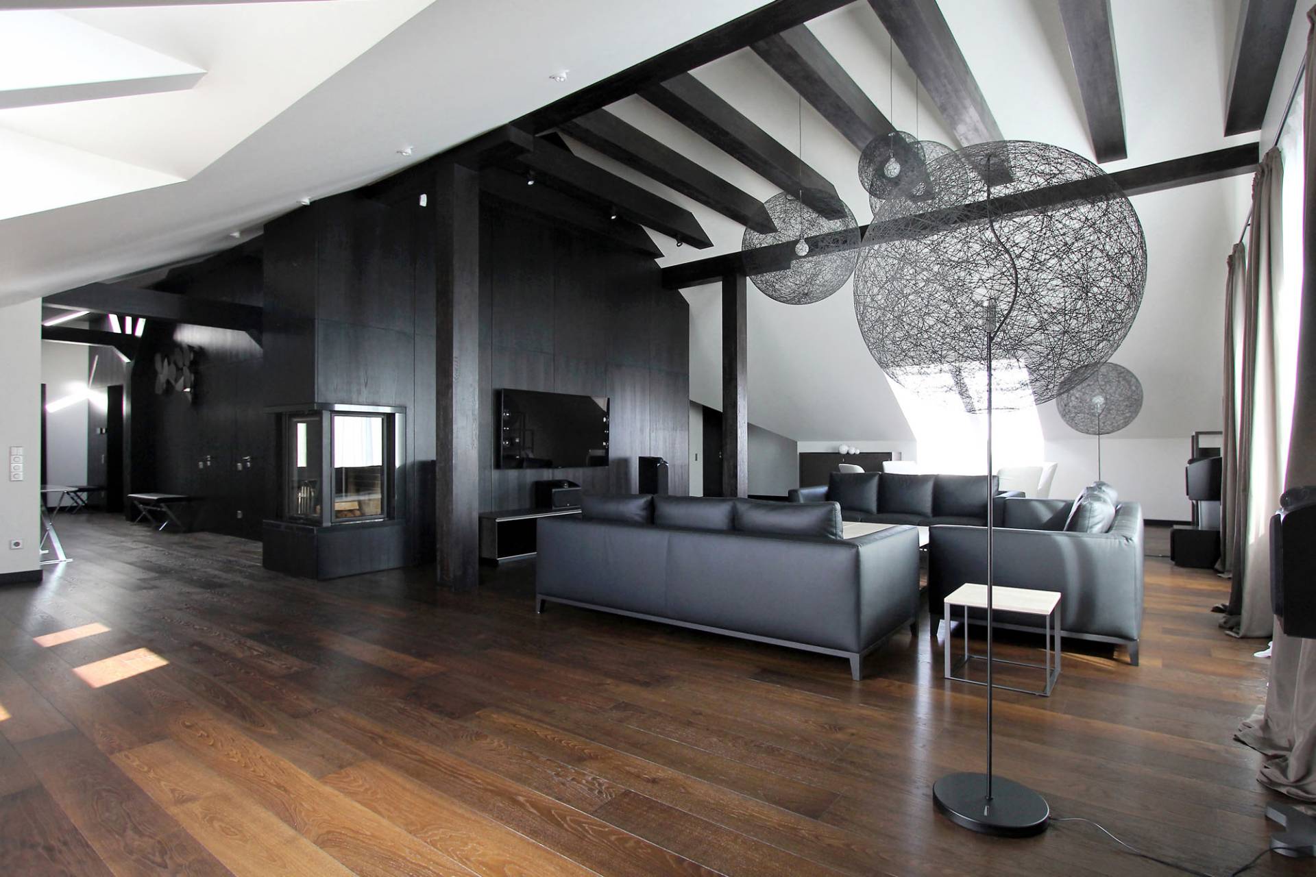 Один этаж можно сделать в виде студии. Так как помещение просторное, его часто обустраивают в стиле лофт или хай-тек.