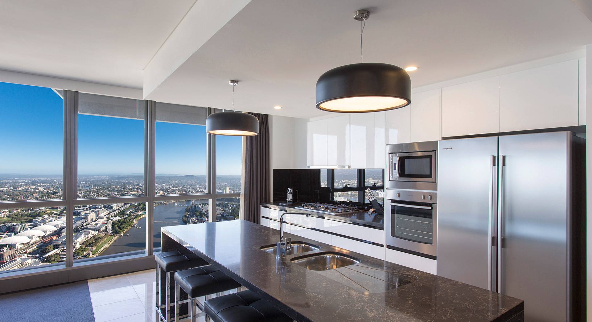 Архитектурная особенность позволяет создать изоляцию от соседей, городского шума, а панорамные окна открывают красивый вид на город.