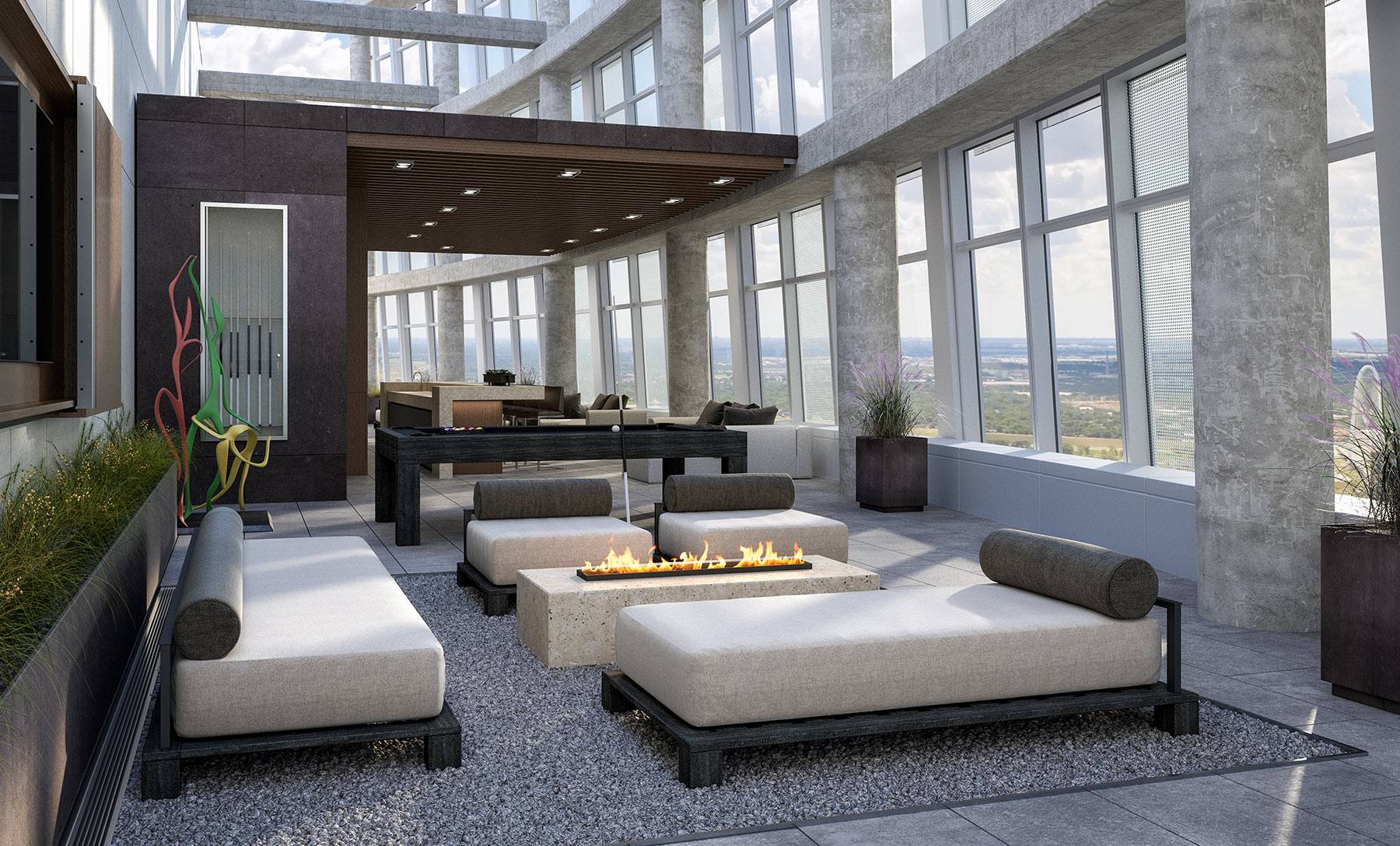 В зоне релакса размещаются диваны, шезлонги, небольшие столики, а там, где предусмотрен активный отдых, можно сделать бассейн, джакузи, поставить столик для настольного тенниса. Если позволяет площадь, бассейн дополняется водной горкой.