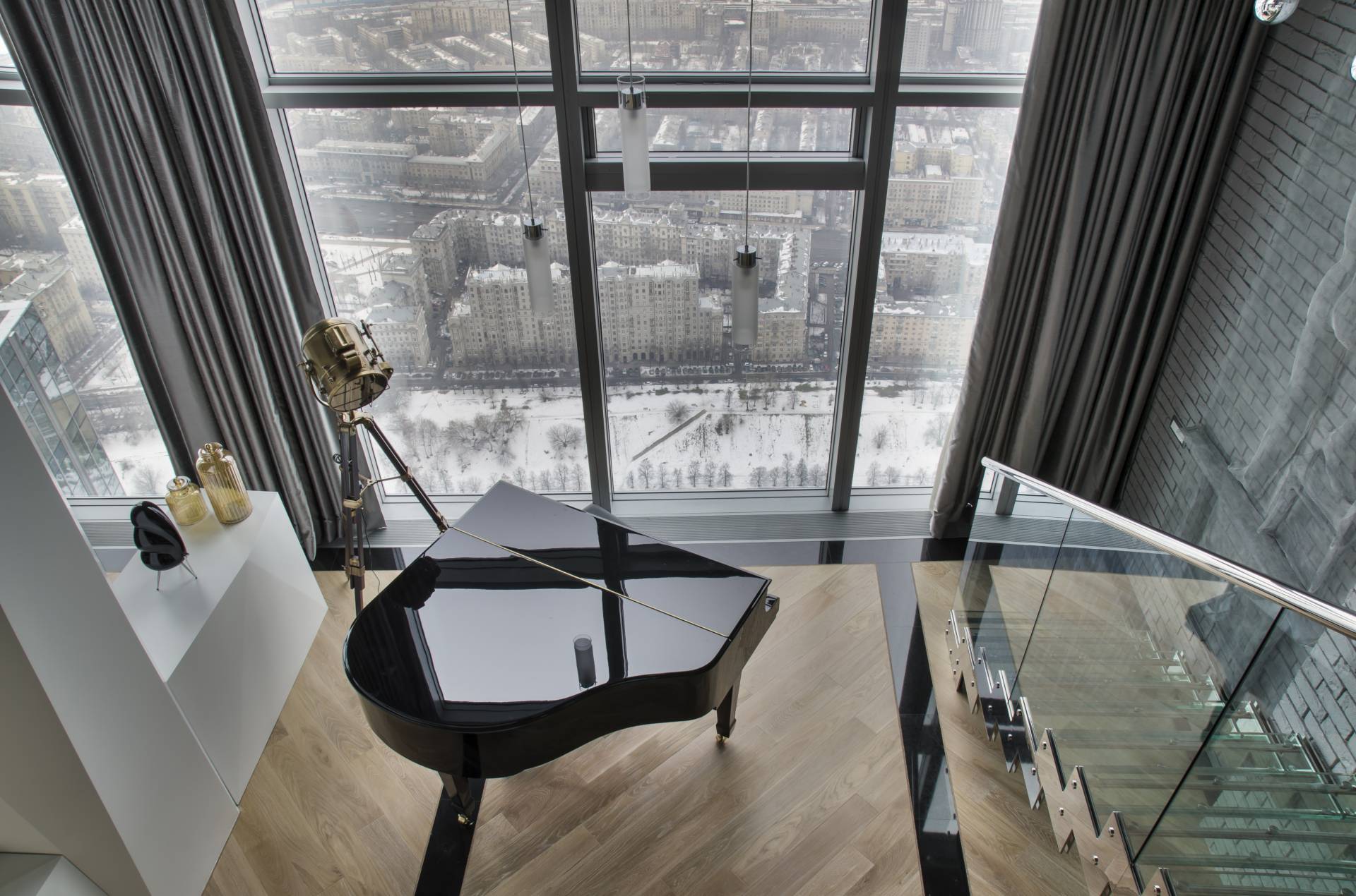 Размер колеблется в разных диапазонах. Площадь может быть 80, 100 и более квадратных метров. Потолки высокие, а планировка свободная, что позволяет зонировать территорию по своему усмотрению или сделать студию. - Панорамное остекление.