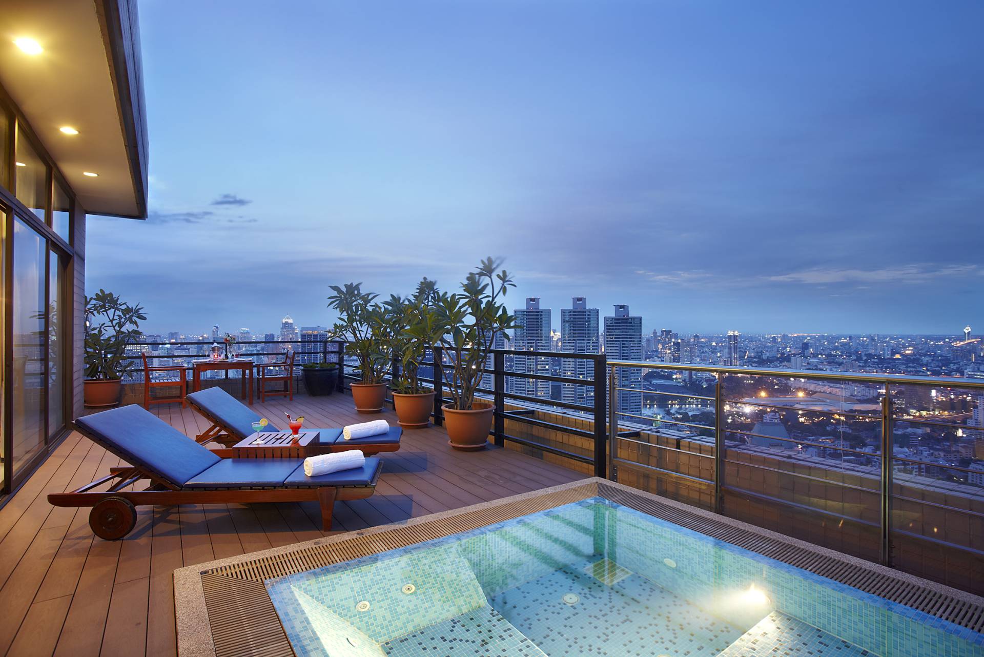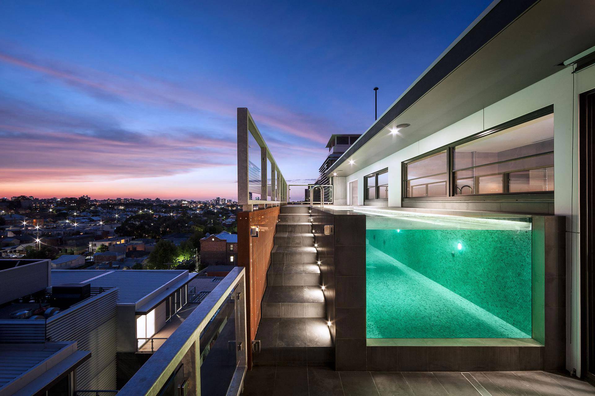 Размещается на террасе. Прежде всего, нужно выяснить у застройщика допустимую нагрузку на напольное покрытие и исходя из этого, рассчитывать размер бассейна.