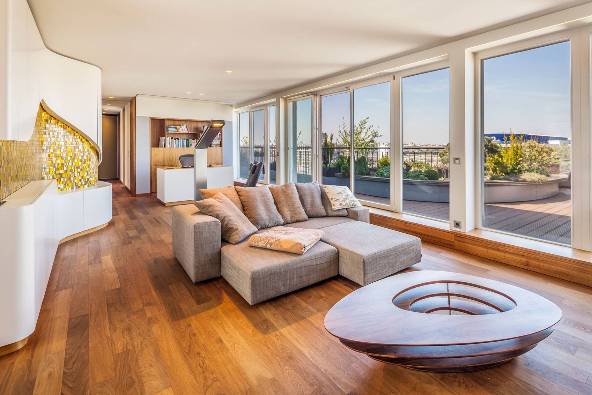 Позволяет использовать дневное освещение для реализации выбранного стиля. Да и само по себе выглядит привлекательно. В любое время суток можно любоваться красивым видом города и заходом солнца. - Терраса.