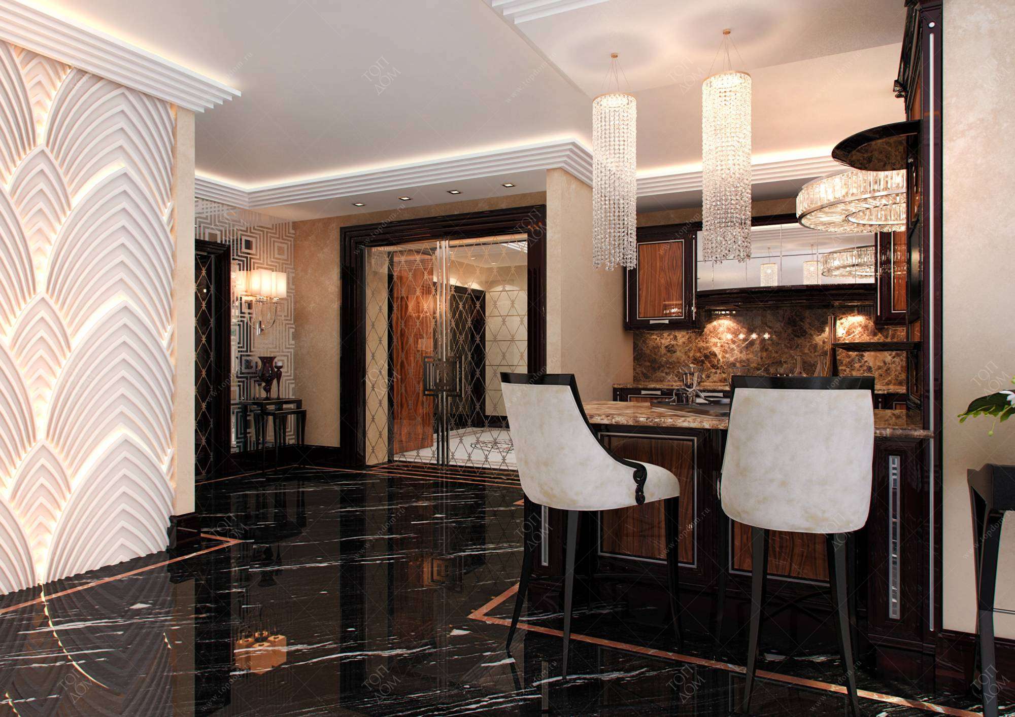 При выборе стиля арт-деко для дизайна квартиры наиболее подходящий отделочный материал для пола – мраморные плиты. Характерный прием – комбинация черного и белого мрамора в квадратных или прямоугольных фрагментах, рисунке шахматной доски.