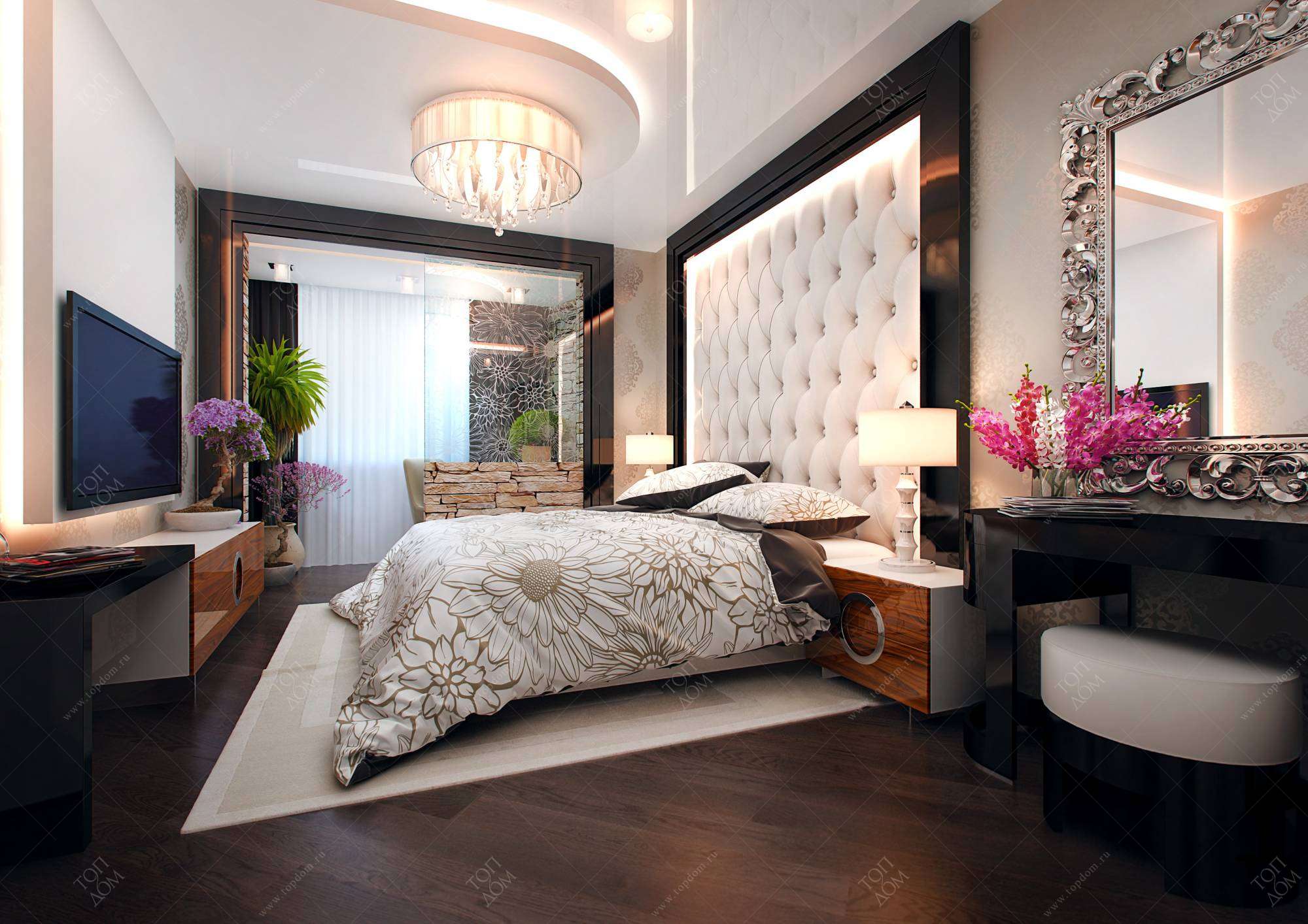 Изголовье кровати обязательно отделывается дорогой обивкой, по форме это чаще всего прямоугольная либо овальная конструкция. Плоскость стены позади кровати выделяется тканевой отделкой, объемными панелями, орнаментальными обоями.